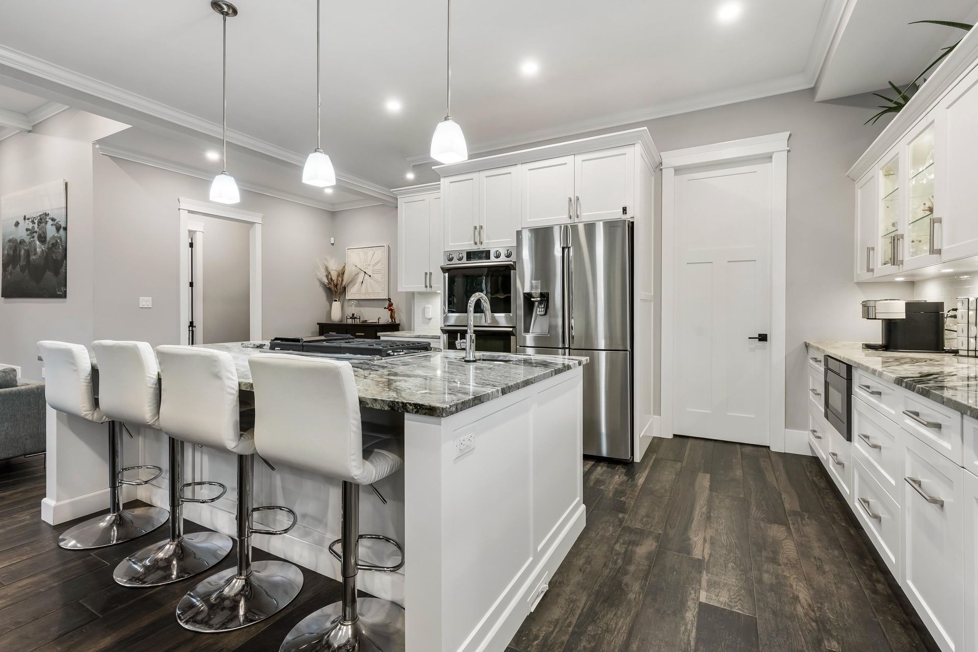 Executive custom home backing onto Kinkora Golf Course featuring a chef’s kitchen w/ high-end appliances, oversized island & a great room w/ floor-to-ceiling windows that fill the space w/ natural light. Off the kitchen, enjoy a private enclosed patio w/ fireplace & hot tub for year-round entertaining. Upstairs offers 4 spacious bedrooms, including a luxurious primary suite w/ spa-inspired ensuite, steam shower & soaker tub. Lower level includes a bright 2-bed suite ideal for in-laws or rental. Additional highlights: detached 1-bed coach house, double-wide lot & car enthusiast’s dream garage. Unobstructed golf course views w/ no rear neighbours—an estate-style property in one of Chilliwack’s most sought-after locations.