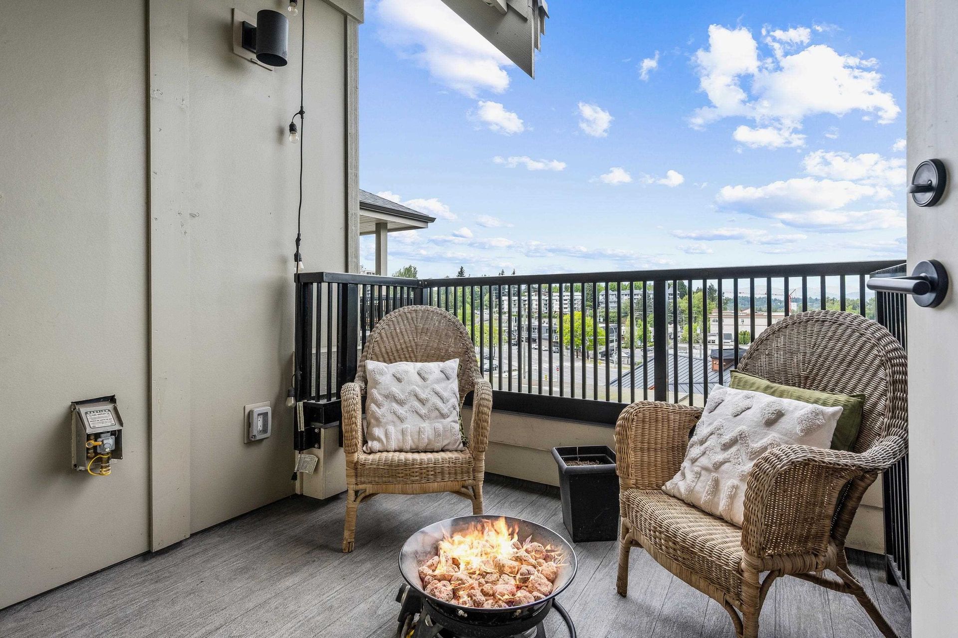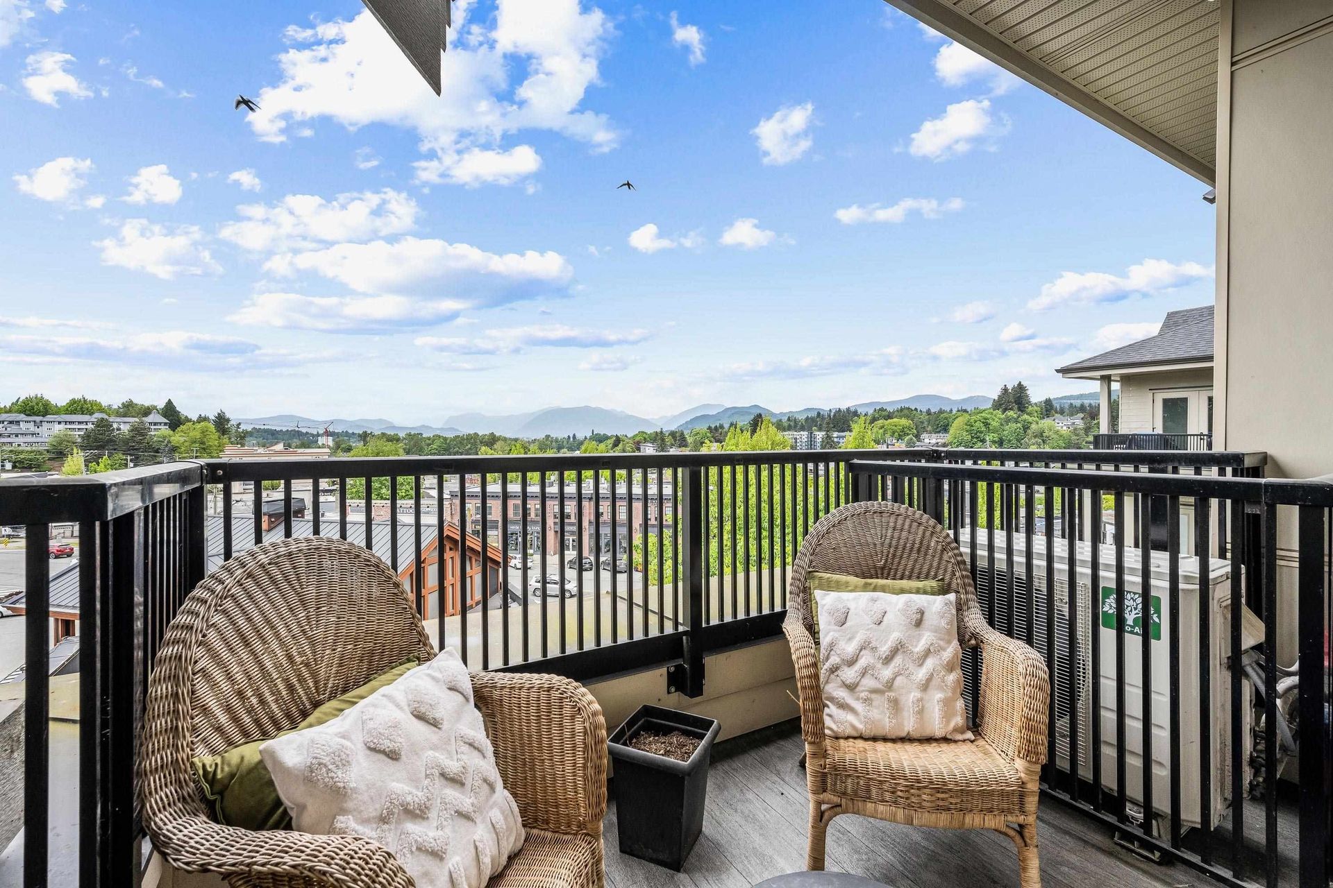 Welcome to Upper Montrose in the heart of downtown Abbotsford! This top-floor 3 bed + den, 2 bath home offers 1,225 sqft of open-concept living with stunning northern views. Features include A/C in the living room and primary bedroom, a gourmet kitchen with quartz counters, stainless appliances, large island, and gas BBQ hookup on the patio. The spacious primary suite boasts walk-through closets and a double-sink ensuite. The versatile den is perfect for a nursery, office, or extra storage. Enjoy 2 parking stalls, family-friendly amenities, and proximity to schools, shops, cafes, gyms, Old Yale Brewing, and the new transit loop.